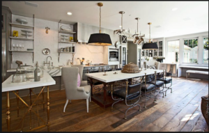 La cucina è pensata con la disposizione dei mobili, sedie, poltrone complementi di arredo e illuminazione con una simmetria precisa, è molto severa nei materiali e se non fosse per le generose apertura senza tende sarebbe un “laboratorio di una pasticceria”!