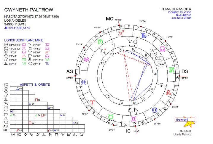 Gwyneth Paltrow attrice statunitense, figlia d’arte, il padre era regista e la madre attrice, anche il fratello è attore. Cresciuta in una numerosa famiglia (ha una sorella attrice anche lei) ha il Sole nel segno della Bilancia con Plutone, Mercurio e Urano, l’energia è esplosiva ed è di tipo Aria.