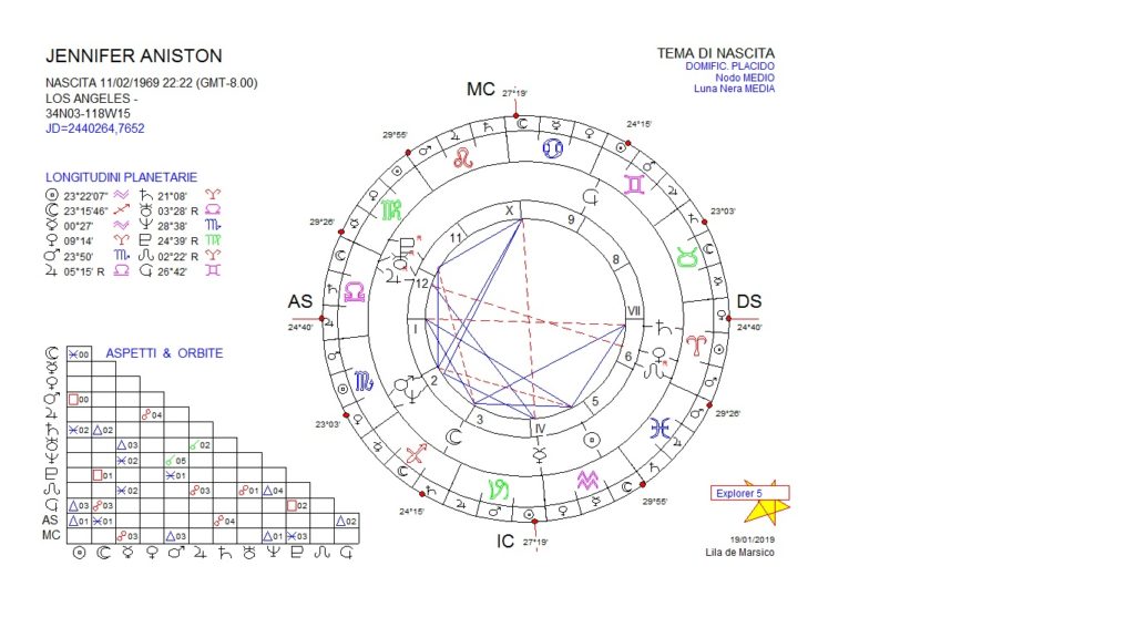 Il Sole Acquario è a pochi gradi dalla quinta Casa (il cinema, lo spettacolo), mentre la Luna in Sagittario evidenzia sia l’origine greca del padre (il vero cognome della Aniston è Anastassaki), sia l’origine italiana, irlandese e scozzese della madre Nancy Dow che è un’attrice, scrittrice ed ex modella.