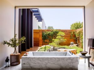 Il bagno è il luogo ‘sacro’ per potersi rilassare e Jennifer Aniston sapientemente ne ha uno che si affaccia su un giardino zen, direi che è perfetto per Lei = un bagno molto creativo! Sottolineo l’originalità della vista e la disposizione della vasca; è un po’ austera e fredda, ma il verde e il legno dall’esterno, ne riscaldano l’atmosfera.